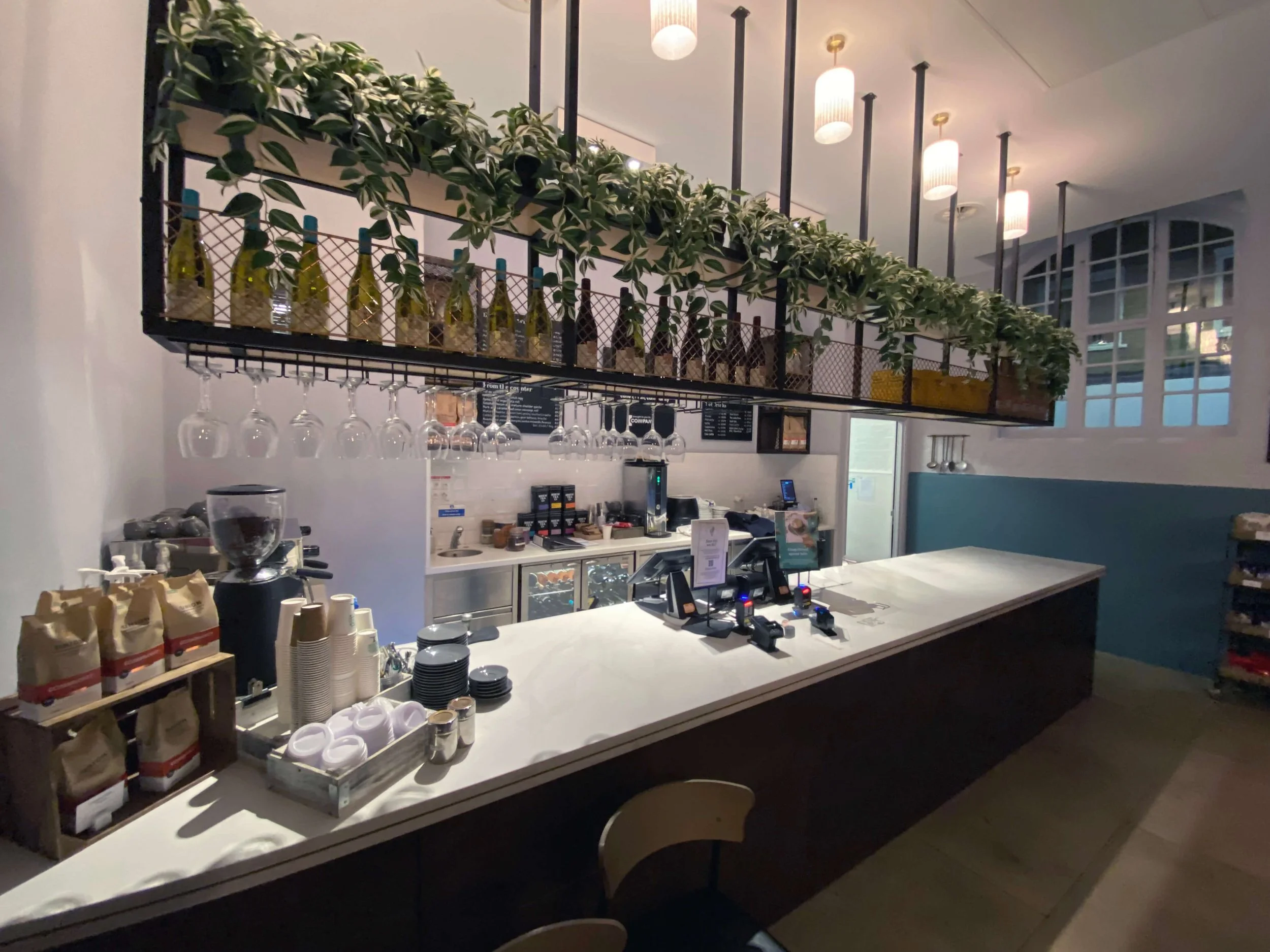 The serving counter was redesigned to accommodate a seamless, inter-changeable hot and chilled induction panel, which we recessed flush into a countertop. In addition, we added a new high-level gantry to provide storage for wine glasses and bottles and display plants. Behind the new counter/bar are chalk-board style menu boards and shelved displays of coffee bags from Union Hand-Roasted and Well Grounded.