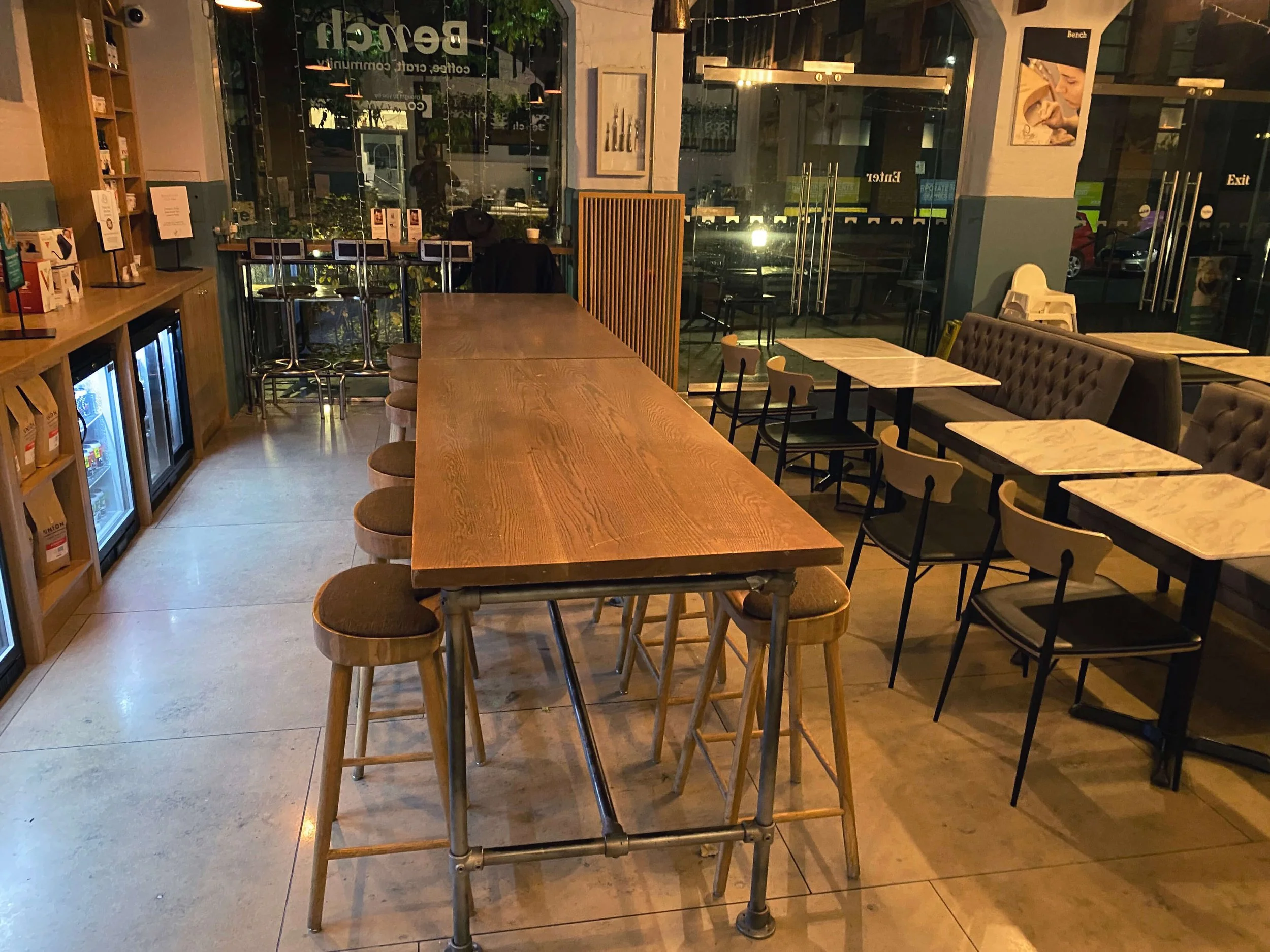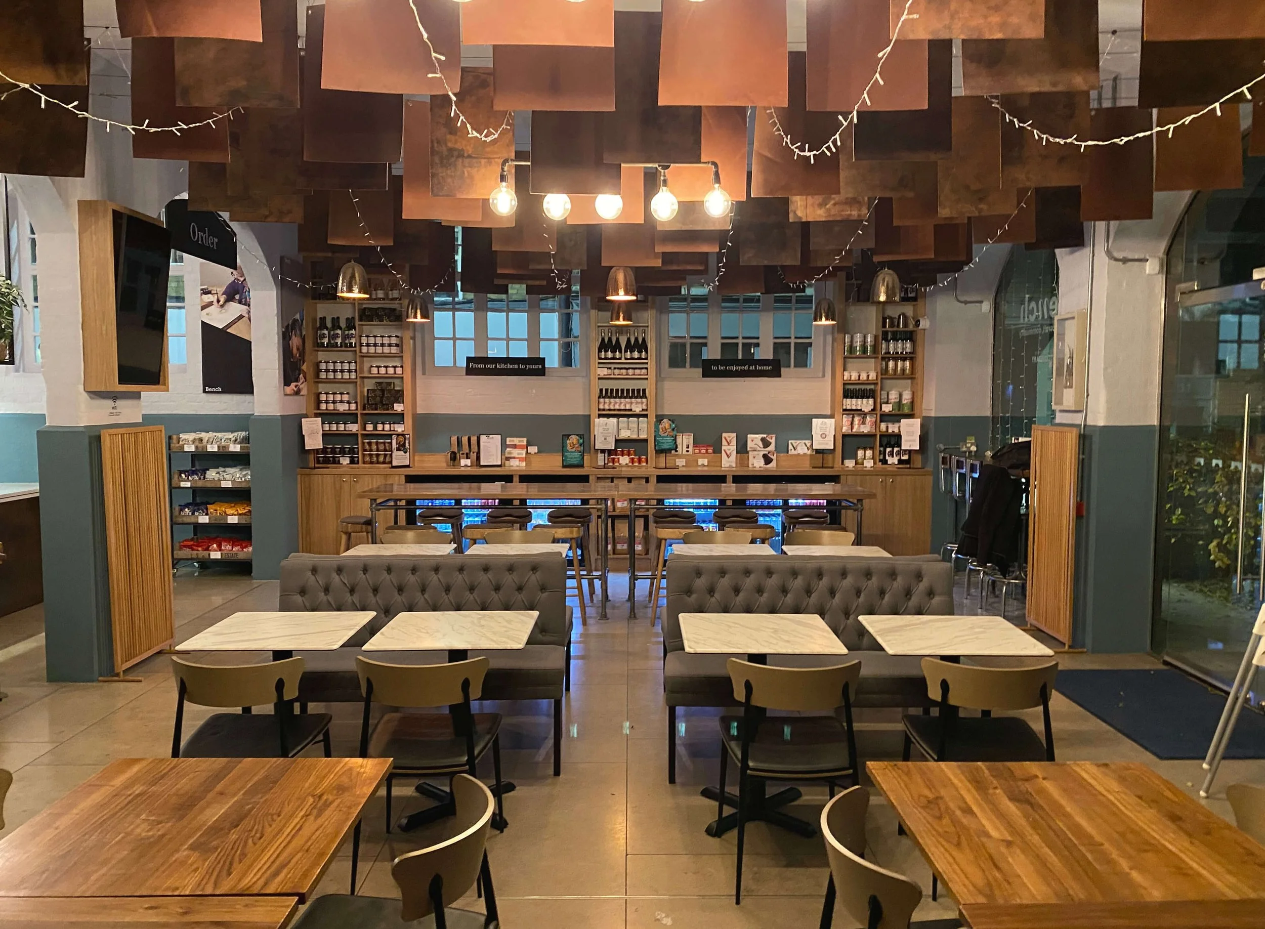 We were commissioned by Company of Cooks to collaborate with them and the Bench team on refreshing the café’s interiors and achieving six key things: increasing the number of covers, introducing more comfortable seating to complement the existing options, improving circulation throughout the café and to the main service counter, adding a retail element, overcoming the harsh acoustics in the venue, and redesigning the serving counter to facilitate a bar offer in the evenings.